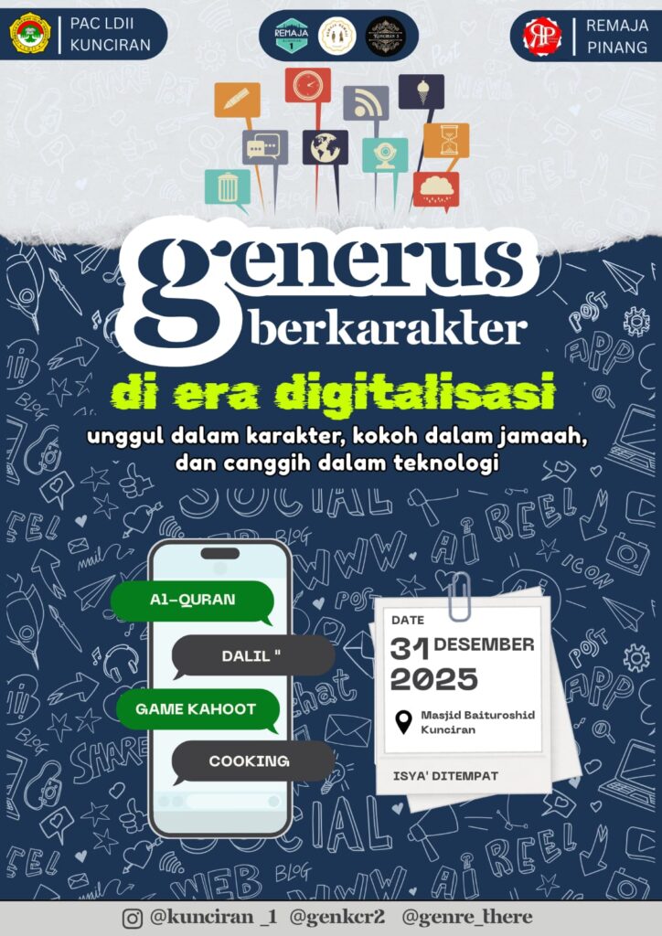 TANGERANG (3/1) – Mengantisipasi tantangan zaman yang serba digital, puluhan remaja PAC LDII Kunciran mengisi malam pergantian tahun dengan kegiatan yang sarat makna. Bertempat di Masjid Baiturrosyid, para generasi penerus (generus) berkumpul untuk mengikuti Pengajian Akhir Tahun dengan tema sentral: “Membangun 29 Karakter dan Kefahaman Jamaah di Era Digitalisasi”.